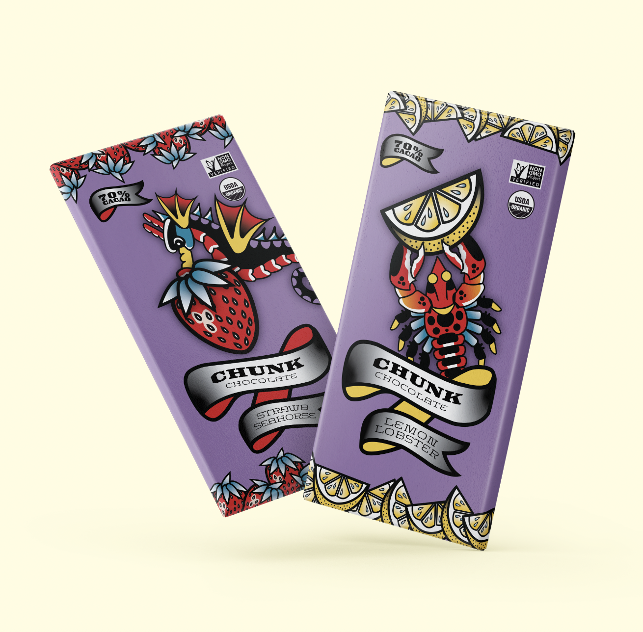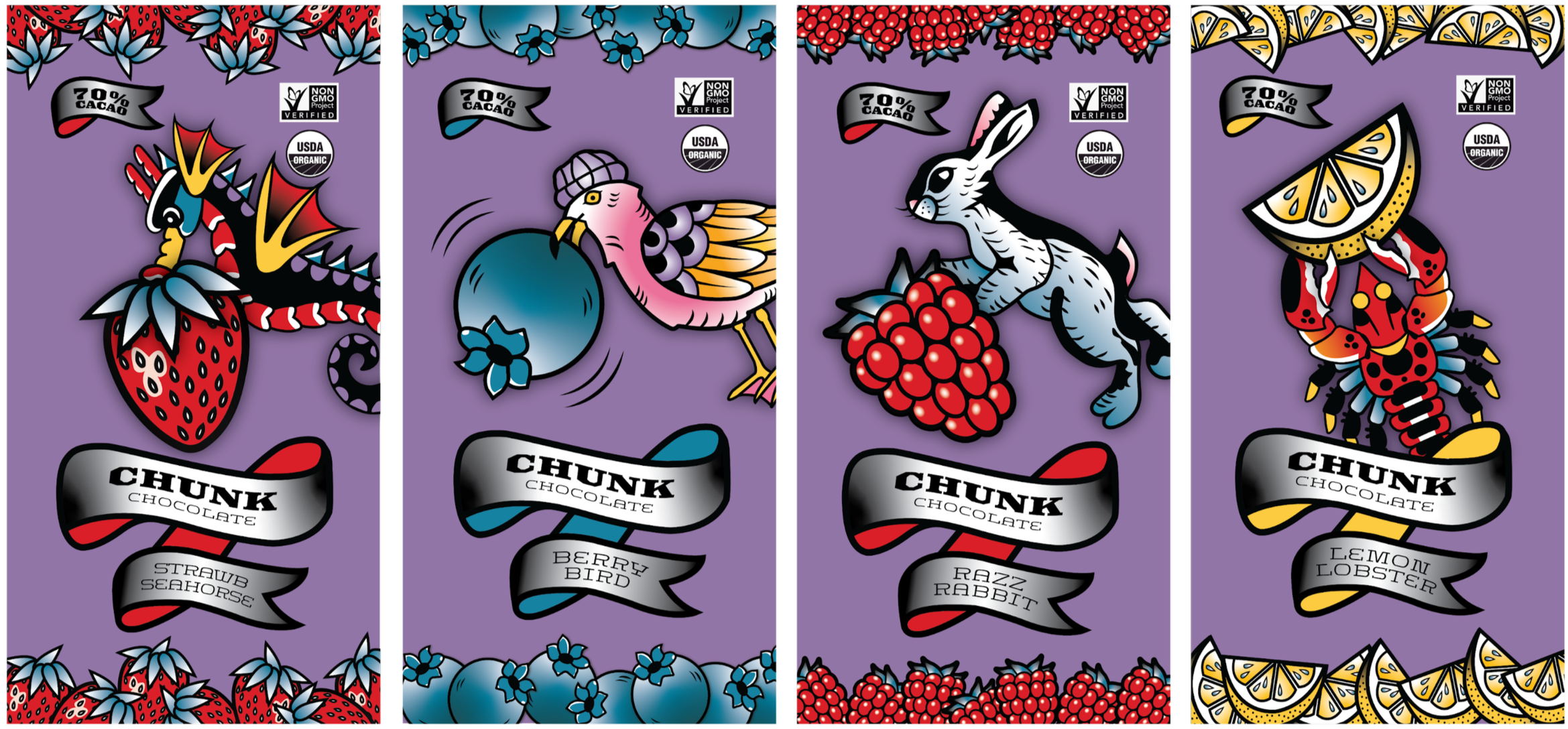 Before Chunk Chocolate, the characters were created for a stamp illustration project inspired by American Traditional tattoos