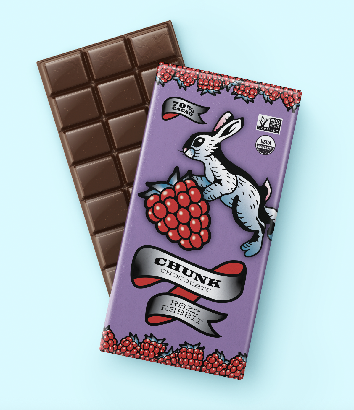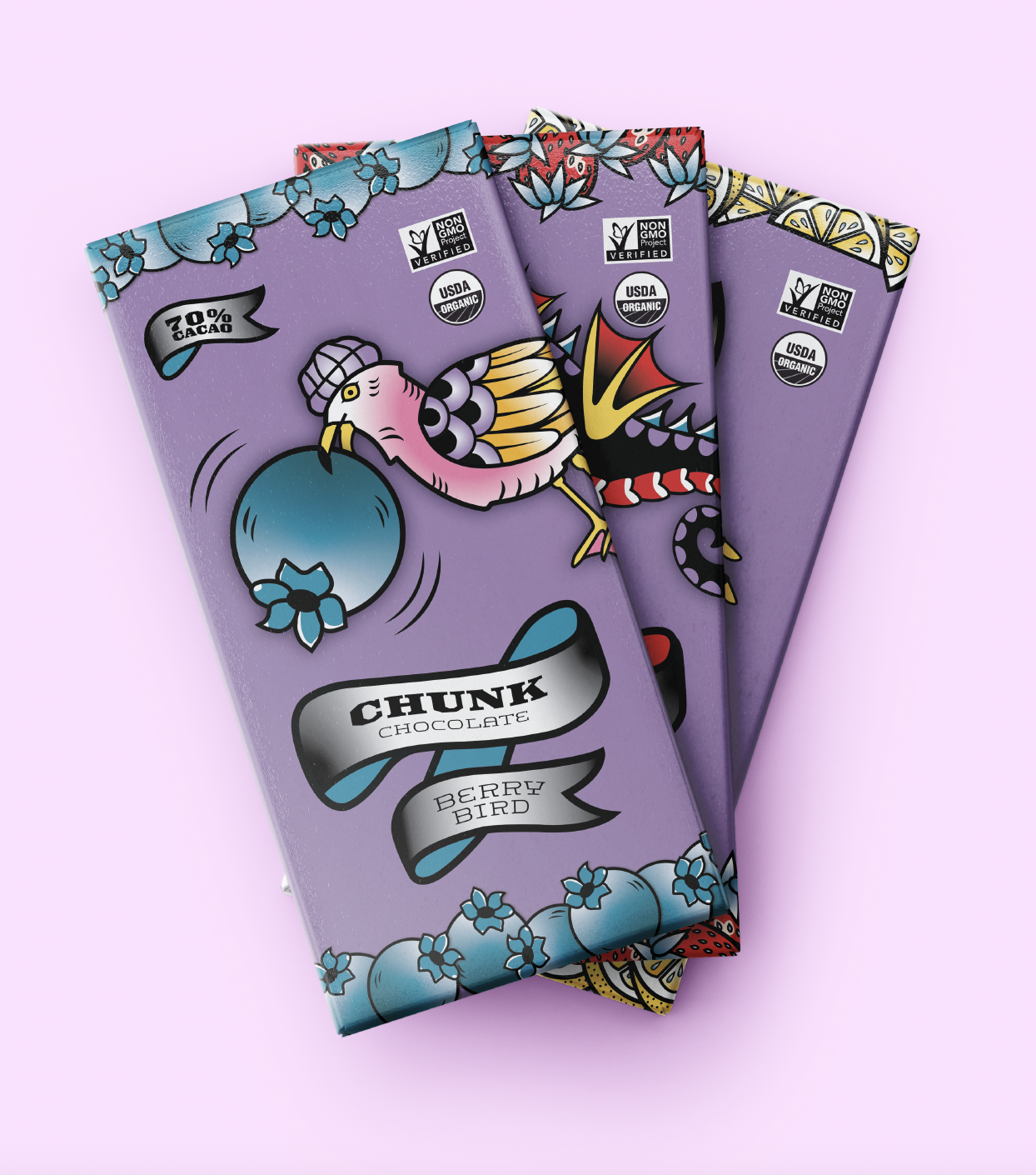 The characters were transformed into fruity chocolate mascots to support the bold and vibrant branding of Chunk Chocolate