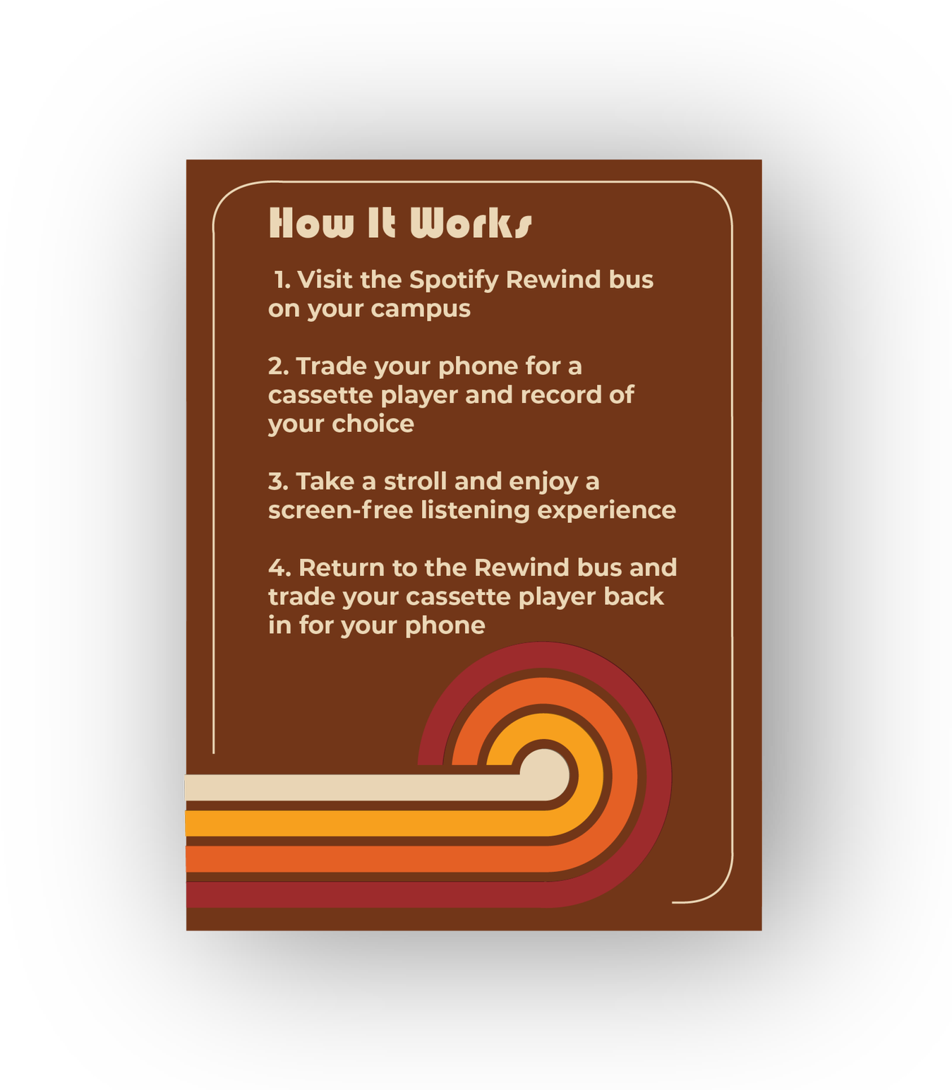 Inspired by UNICEF’s Global Initiatives, this campaign reimagines mental health awareness through a Spotify-sponsored mobile campus experience that travels to universities nationwide. Students disconnect by exchanging their phones for a cassette player and taking a mindful walk while listening to an album, start to finish, without digital distractions.